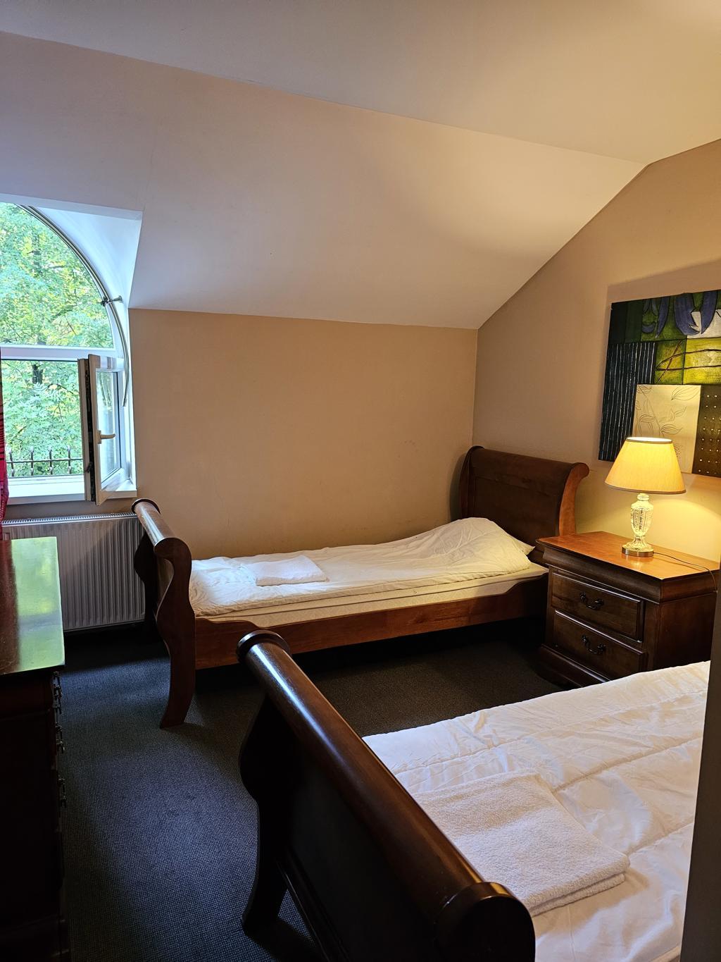 Nasze stylowo umeblowane pokoje gościnne oferują wszystko to, co jest niezbędne dla komfortowego wypoczynku. Wygodne łóżko, łazienka w każdym pokoju i widok z okna na piękny park – to standard, który oczekuje na naszych gości.